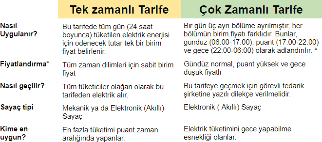 * Çok zamanlı tarife uygulamasında; sayaç saati sürekli yaz saati uygulamasına göre güncellenmemiş sayaçlar için, Ekim Ayının Son Pazar Günü ile Mart Ayının Son Pazar Günü arasında Gündüz 07-18, Puant 18-23, Gece 23-07 saatleri arasında; Mart Ayının Son Pazar Günü ile Ekim Ayının Son Pazar Günü arasında Gündüz 06-17, Puant 17-22, Gece 22-06 saatleri arasında; sayaç saati sürekli yaz saati uygulamasına göre güncellenmiş sayaçlar için yıl boyunca Gündüz 06-17, Puant 17-22, Gece 22-06 saatleri arasındadır.