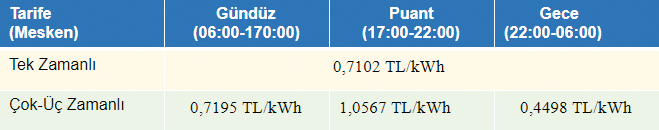 01 Temmuz 2020 tarihinden itibaren geçerli EPDK tarifelerine göre 1 kWh elektrik enerjisinin bedelleri (vergi ve fonlar dâhil) yukarıdaki tablodadır.