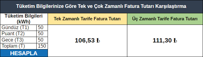 Siz de tüketimlerinizi aşağıdaki hesaplama motoruna girerek tek ve çok zamanlı tarifelerle oluşacak fatura tutarlarını karşılaştırabilirsiniz.